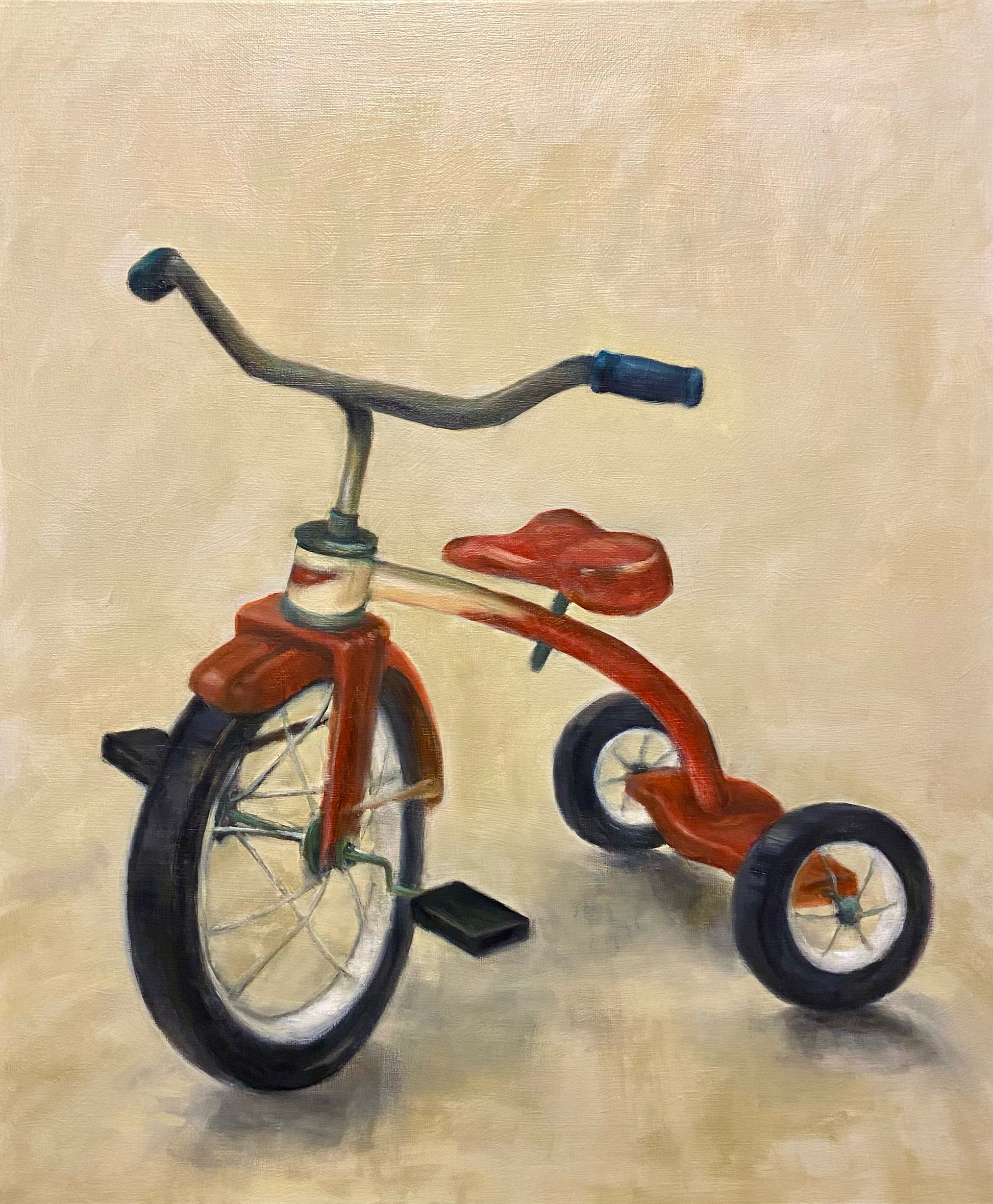 I am intrigued by objects that represent the everyday, the mundane, but that may also reflect a narrative quality. This simple depiction of a tricycle, without a specific environment, allows the viewer to recall a time and a place in their life, hopefully evoking a sense of quiet happiness.