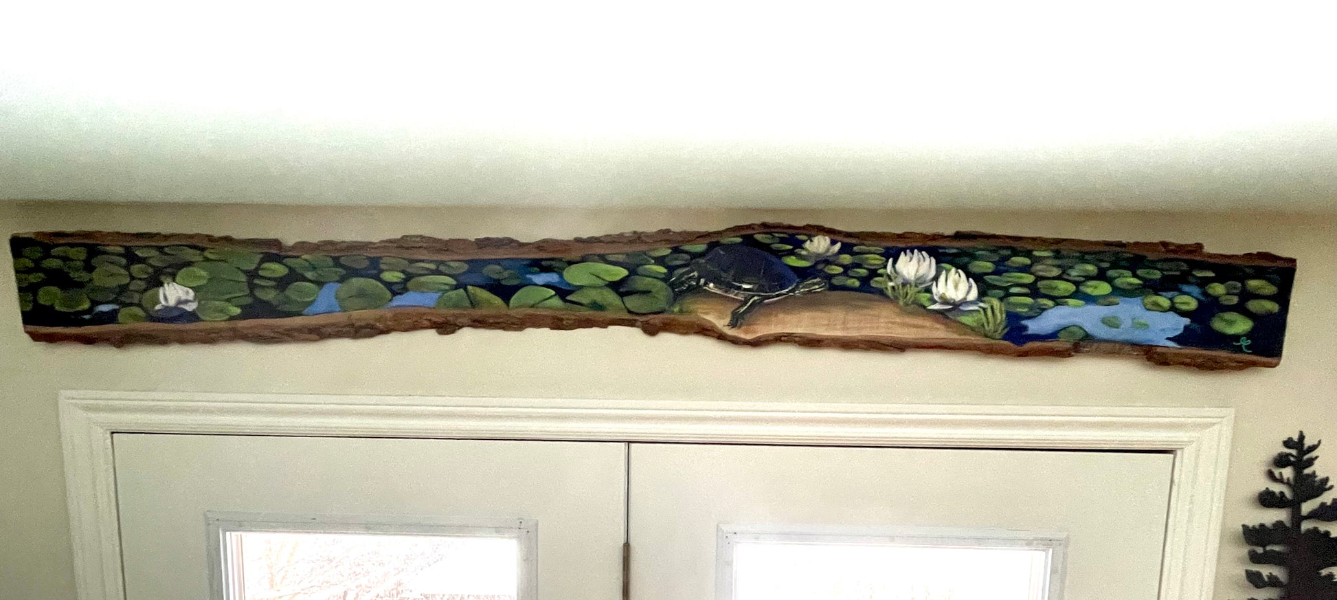 What a unique piece for a special spot in your home or cottage! This acrylic painting features a turtle resting on a log amid a maze of lily pads, perfectly suited to the natural flow of a 6-foot-long live-edge board. A true conversation starter that brings a touch of the lake indoors.
