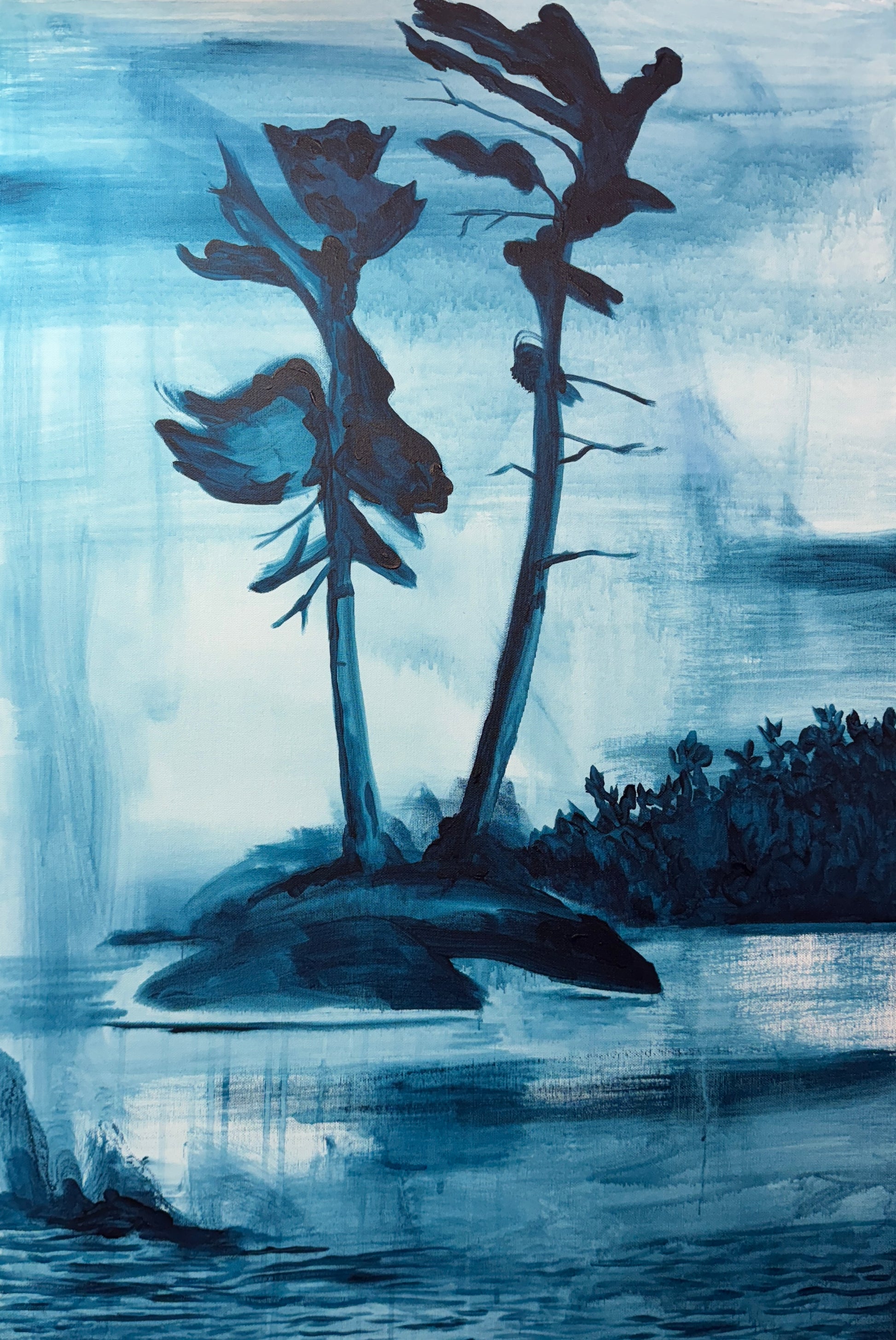 Exciting colour explorations are moving my traditional subject matter into new spaces. I am participating in the upcoming group show 'Monochrome Muskoka' as an ally and having been exploring new palettes. This piece is inspired by the twin lakes in Gravenhurst that I paddled in my twin kayak with a friend. Near the meeting of Turtle Lake and Loon Lake, a small island proudly displays these two pine trees.