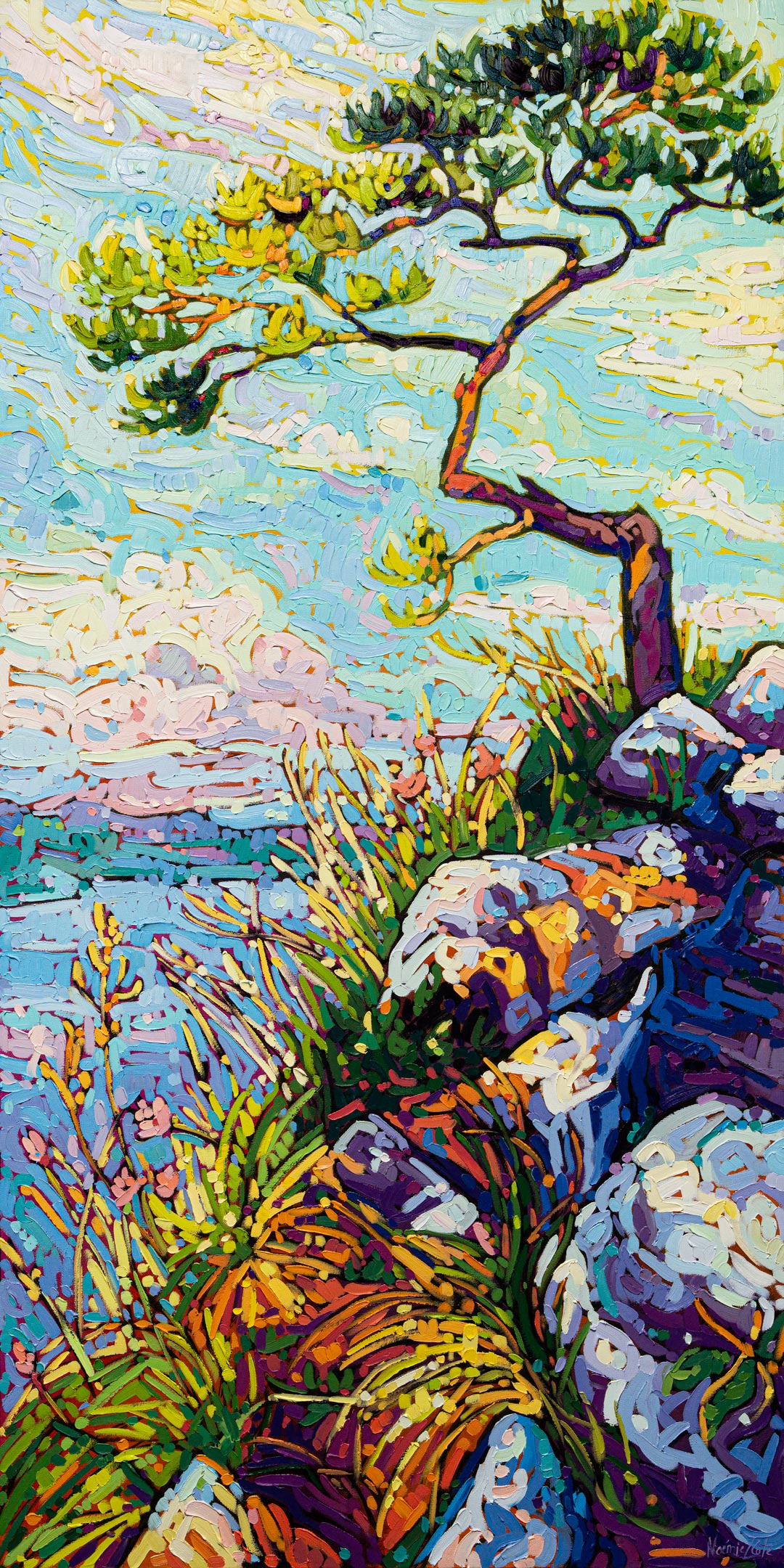 Based on a variety of reference photos and imagination. This painting depicts a sun kissed twisted pine in the Georgian Bay area. The textured oils is luscious where shadows are created based on the light source.