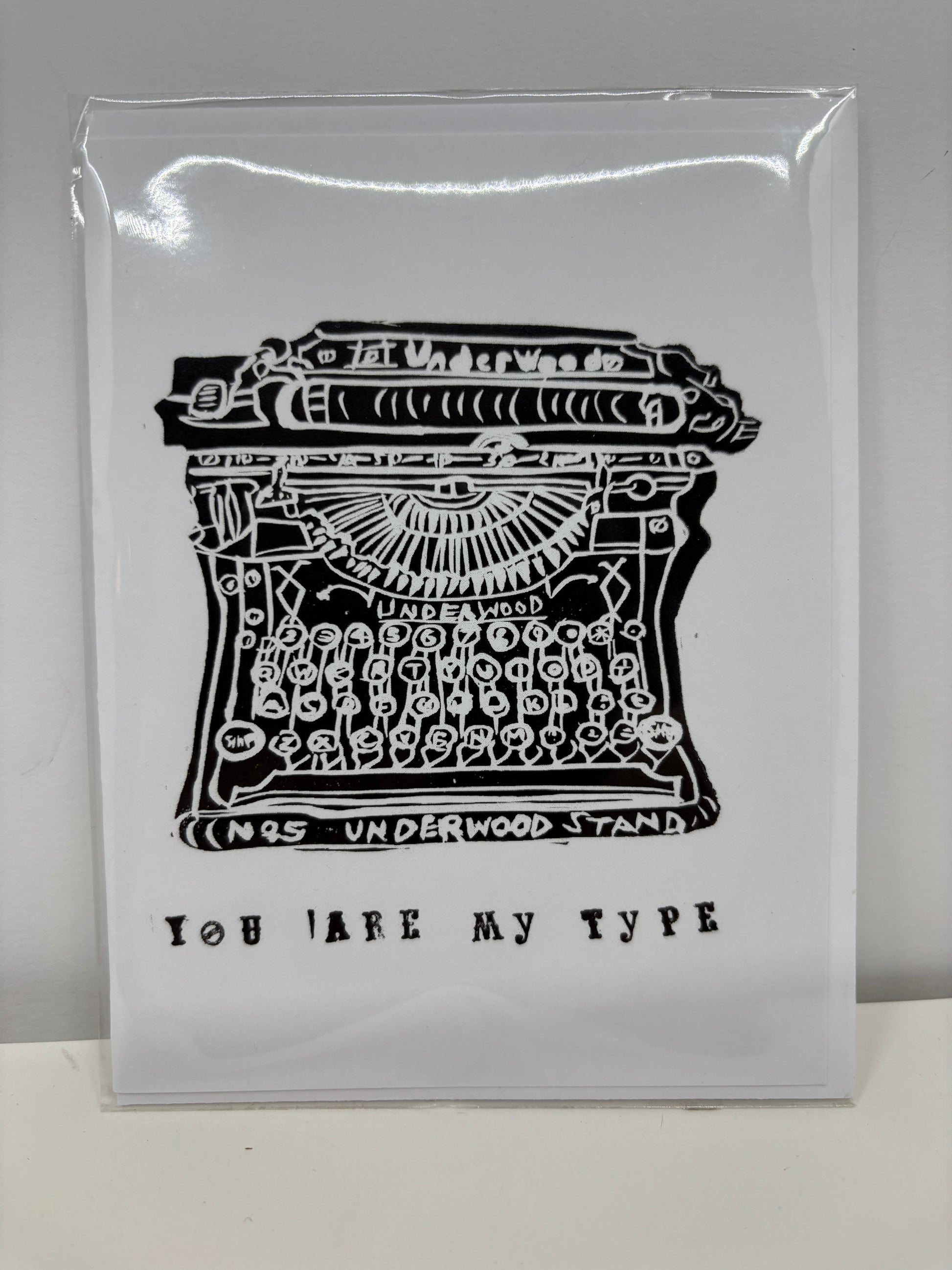 "You are my type" Greeting Card with a vintage 100 year old Underwood Typewriter on the front The card is blank inside so you can write a special note. The typewriter is a reproduction of an original relief print by Elise Muller.