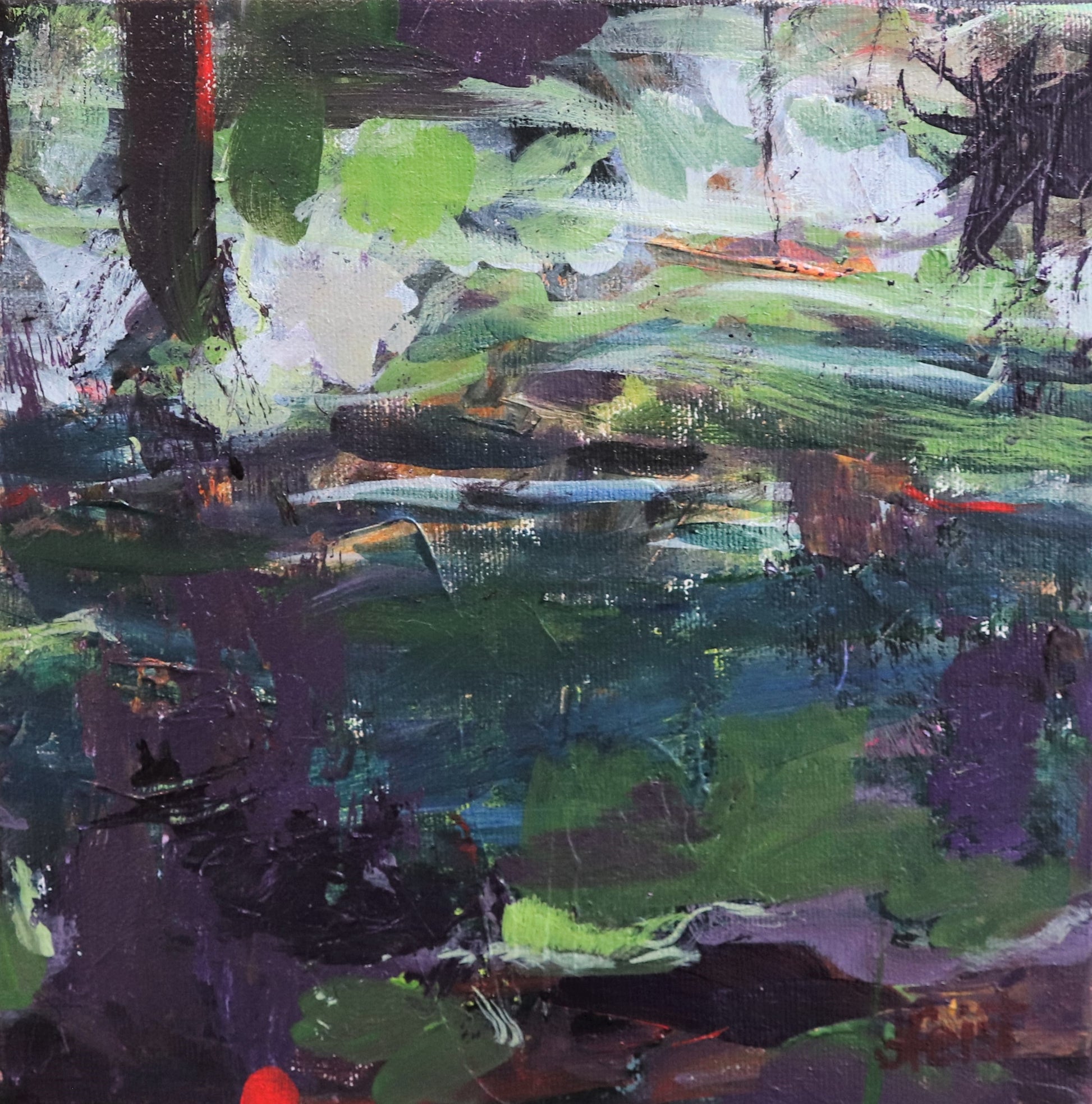 Untamed #3, 8" x 8", acrylic on canvas, is a non-objective painting. Movement and energy carries your eye around the piece. It has a subtle hint of trees and water, like its two other companion pieces. Finished with a narrow black frame.