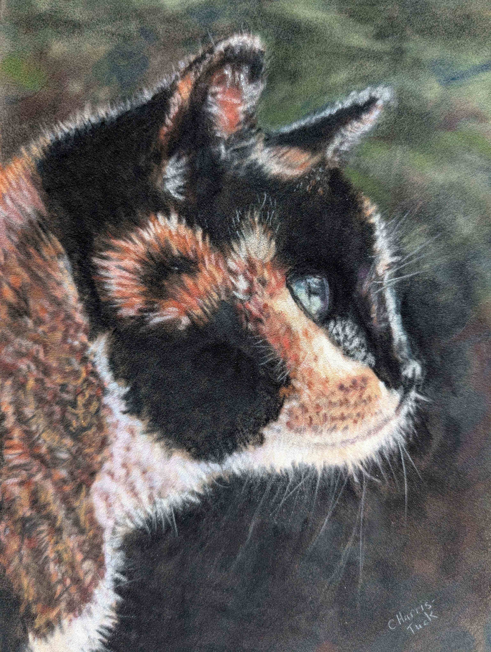 This portrait has been rendered in soft pastel on Artist Quality Hahnemuhle velour. I use this special paper when I want to show the lovely dense fur on an animal. I love the beautiful green eyes on this cat. They speak volumes about her inner thoughts. The capture happened when she was watching a bird at the feeder. She was hopeful that someone would open the door so that she could pounce!
