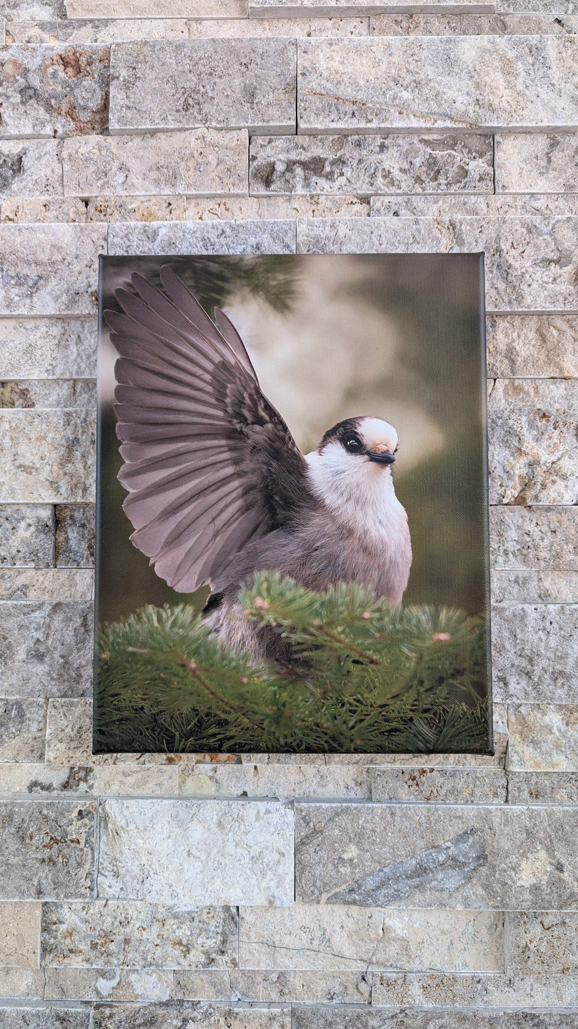This photograph of a Canada jay was taken at Algonquin Park. This bird was flapping about while perched in an evergreen tree, and I was lucky enough to capture it with its wing fully extended.